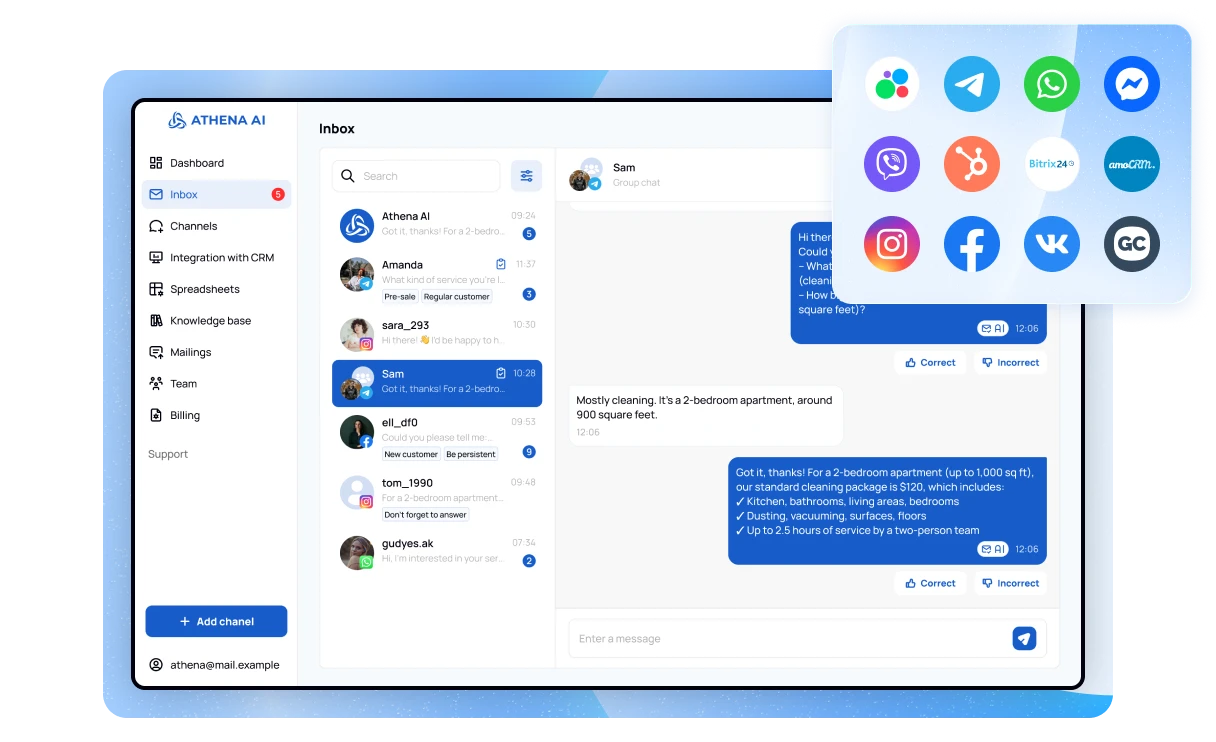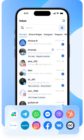 Athena can reply to customers, move deal cards, fill out client profiles, and transfer the conversation to a manager