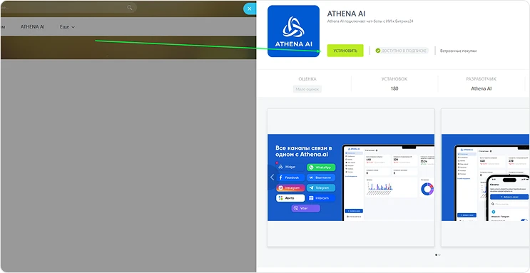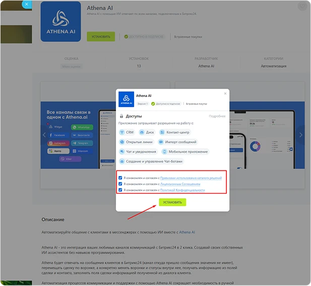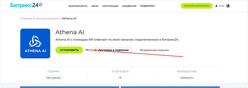 - Далее проходим на страничку установки интеграции -> Нажимаем «Установить».