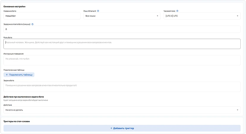 - Задайте по умолчанию поля, которые заполнит Афина ИИ – нажав кнопку «Добавить», и выбрав нужные параметры.
