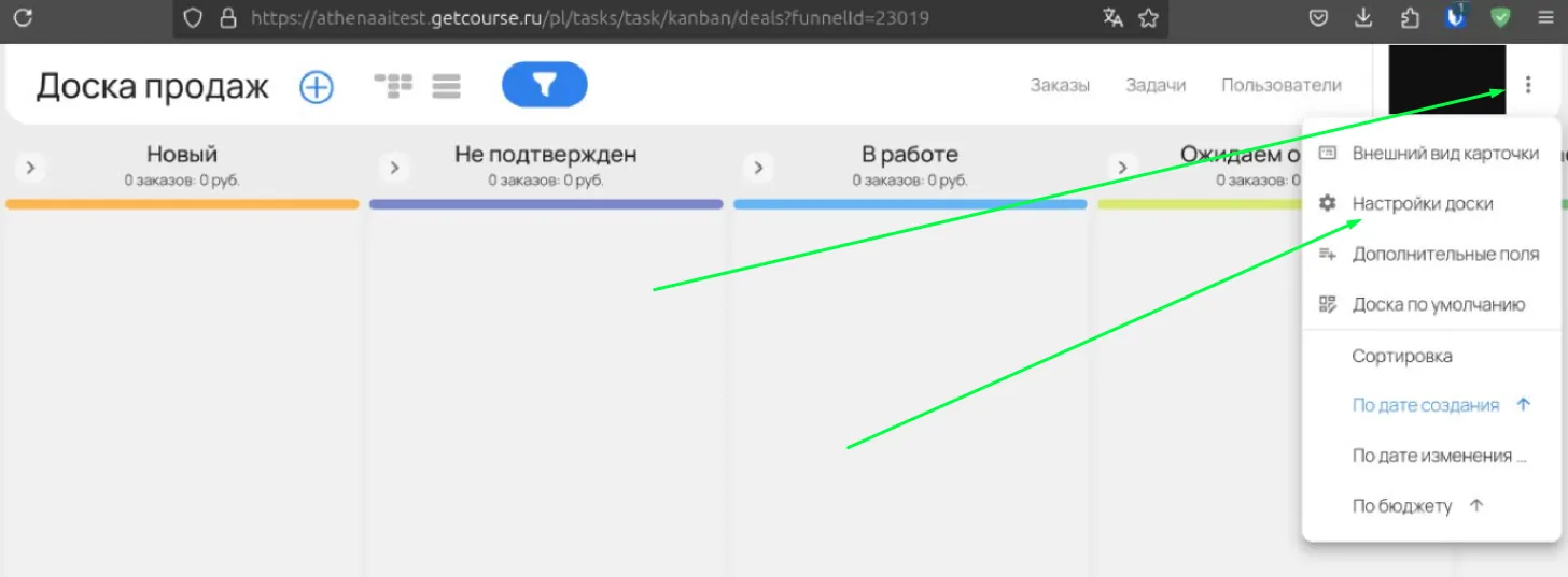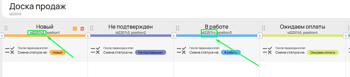 Указать ID доски продаж, стартовой колонки, колонки после выполнения задач.ID доски продаж: